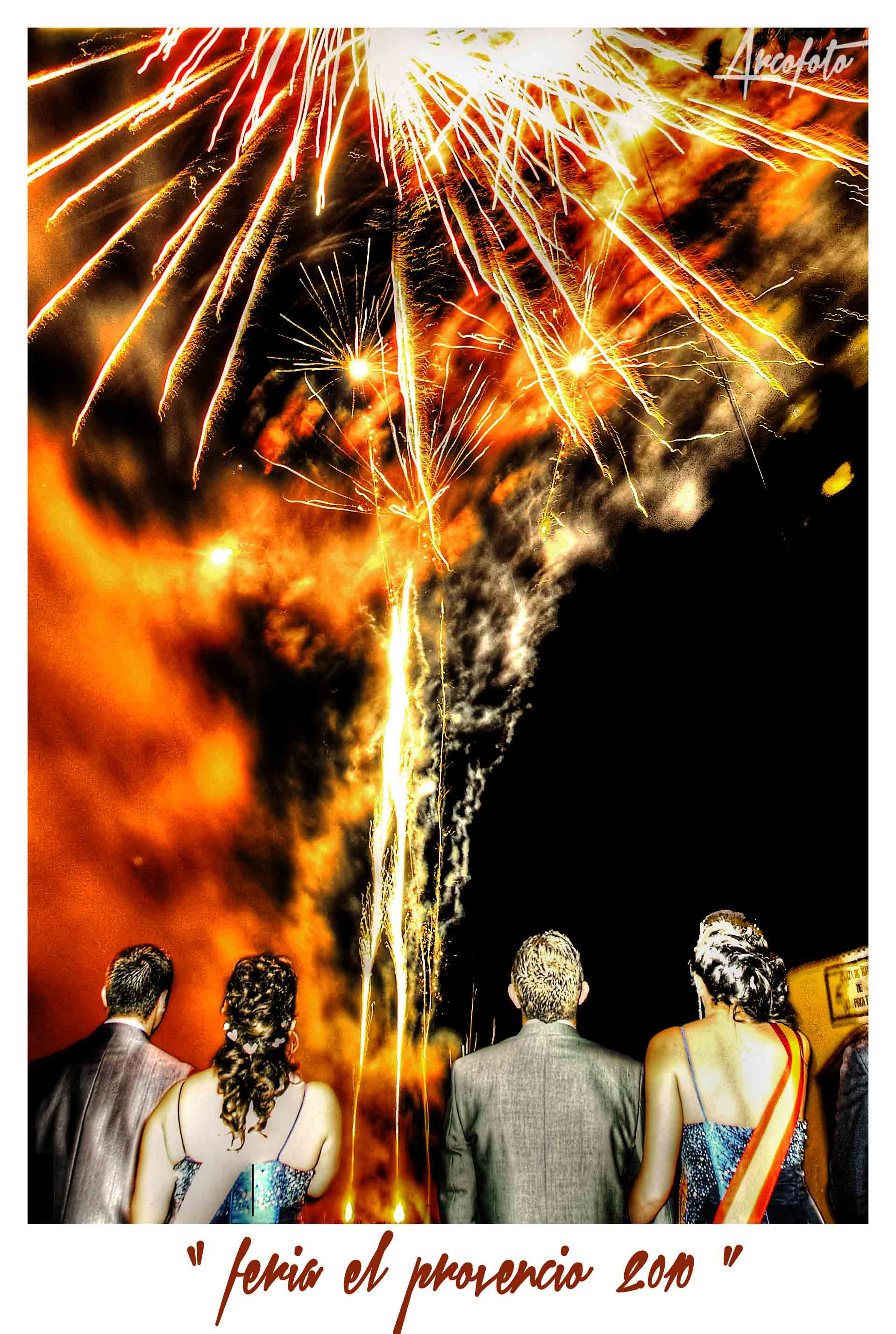 Esta foto se realizó para el reportaje del Ayuntamiento de la Feria del año 2.010, durante la tradicional "pólvora" que marca el inicio de las fiestas. Se buscó un ángulo diferente que captara los fuegos artificiales y se incluyó a la reina de espaldas para situar el espectáculo. Se hizo una toma con baja velocidad para poder coger varias explosiones y durante esta toma se disparó el flash para iluminar a las personas del primer plano y congelar la imagen ya que se hizo a mano, sin trípode. Luego una pequeña edición para saturar colores y este es el resultado final. ¿la veis para portada de un libro de Feria?....jajajaja, bueno el resultado nos parece simpático.