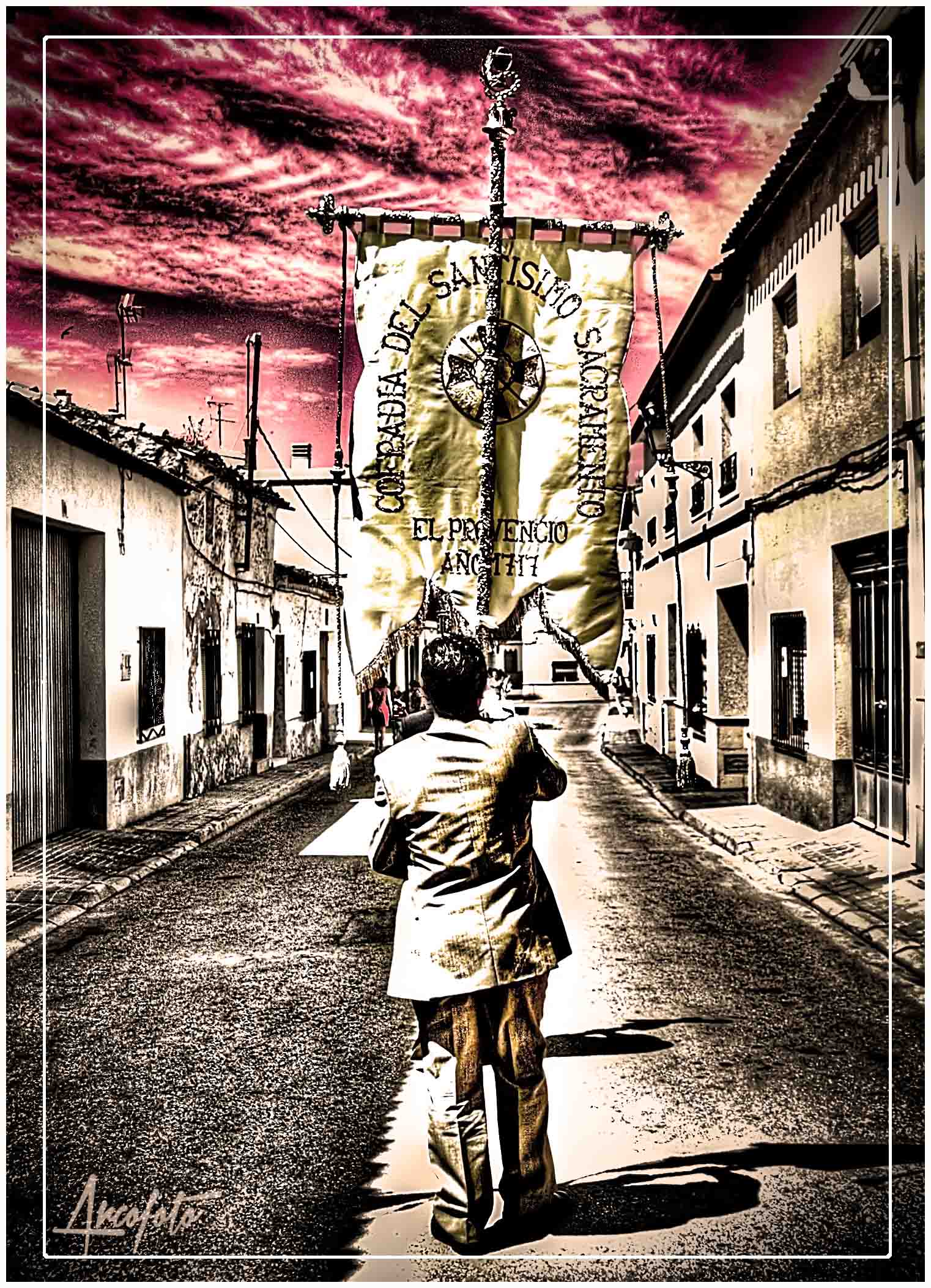 Estandarte de la Hermandad del Santísimo, abriendo la procesión del Corpus, el día 22-6-2014 por las calles de El Provencio.